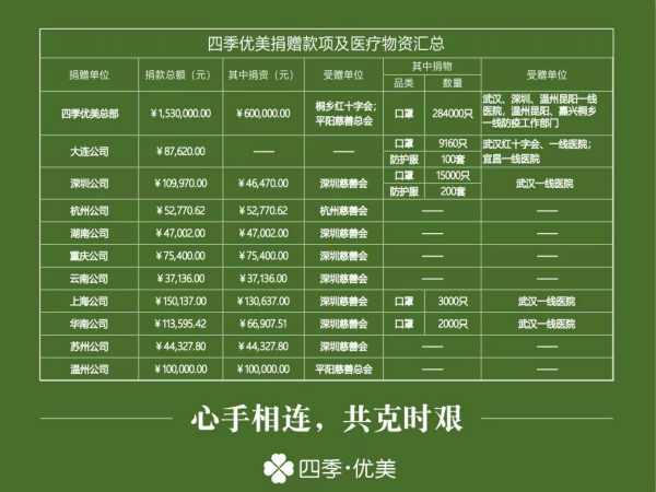截至2月5日,四季優(yōu)美(含公司捐贈、創(chuàng)始人個人捐贈及全國各分公司捐贈)累計為抗疫定向捐贈物資口罩313,160只、防護服300套,資金捐贈1,200,650.93元,合計金額2,347,958.84元。