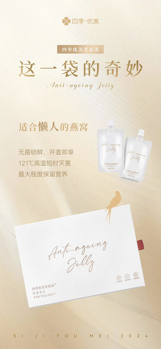 燕窩,自古便是珍饈美味,象征著尊貴與奢華。然而,繁瑣的泡發、挑毛、燉煮等環節,讓很多人望而卻步,畢竟,快節奏才是這個時代的主題詞。四季優美青春凍以先進工藝實現三秒即食,更懂你的所需。氣溫漸升的初夏,這剔透的燕窩果凍,如同少女初妝,清新而不失嬌媚,只看一眼,便已心曠神怡。它如流動的水晶,仿佛凝聚了初夏的日光,閃爍著誘人的光澤。持匙輕拌,那調皮的燕窩絲便翩翩起舞,搖曳生姿,宛若仙子下凡。