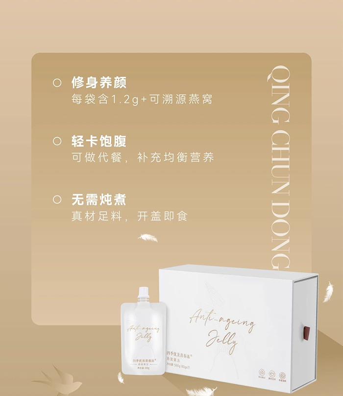 偶爾想給自己輕養(yǎng)一下,含有1.2克可溯源干燕窩的四季優(yōu)美青春凍吸粉不少,除了實打?qū)嵉难喔C,還有魚膠原蛋白肽、葛根粉、奇亞籽、水蘇糖、低聚木糖、低聚果糖等多種原料的加持,為追求“清、調(diào)、補、養(yǎng)”的你帶來更多驚喜;